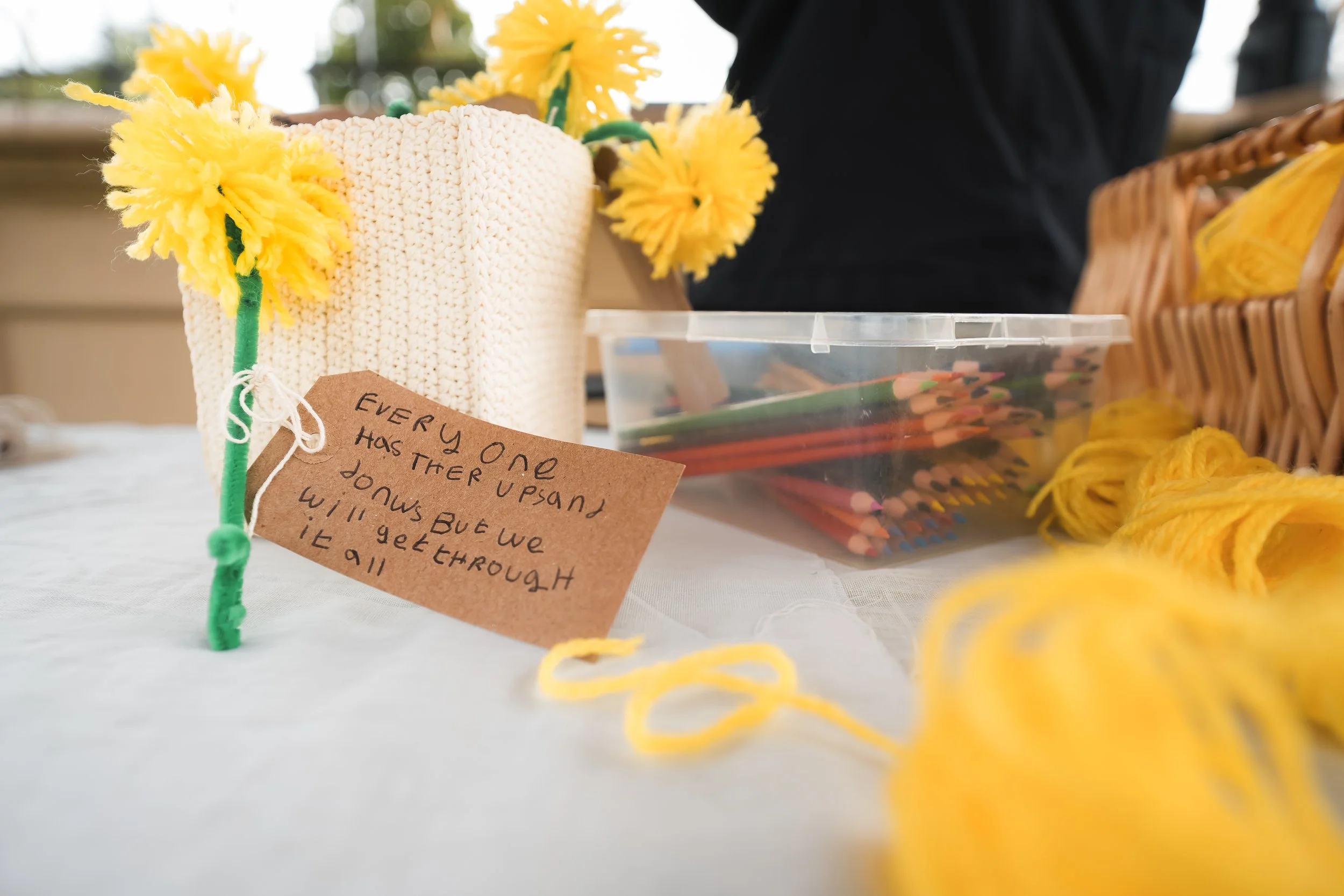 Walk of the Dandelion has an accompanying day-long, open, community craft workshop, where participants make woollen dandelions and share their own positive messages. The dandelion symbol promotes creativity and discussions about resilience, well-being, nature, ecology, and sustainability. Daniel is a survivor who has found resilience and strength through the symbolism of the dandelion, which will grow despite neglect and harsh treatment. Participants become part of the project by making and sharing their dandelions and positive messages with others, reminding them of their resilience, and giving them to Daniel to gift on.