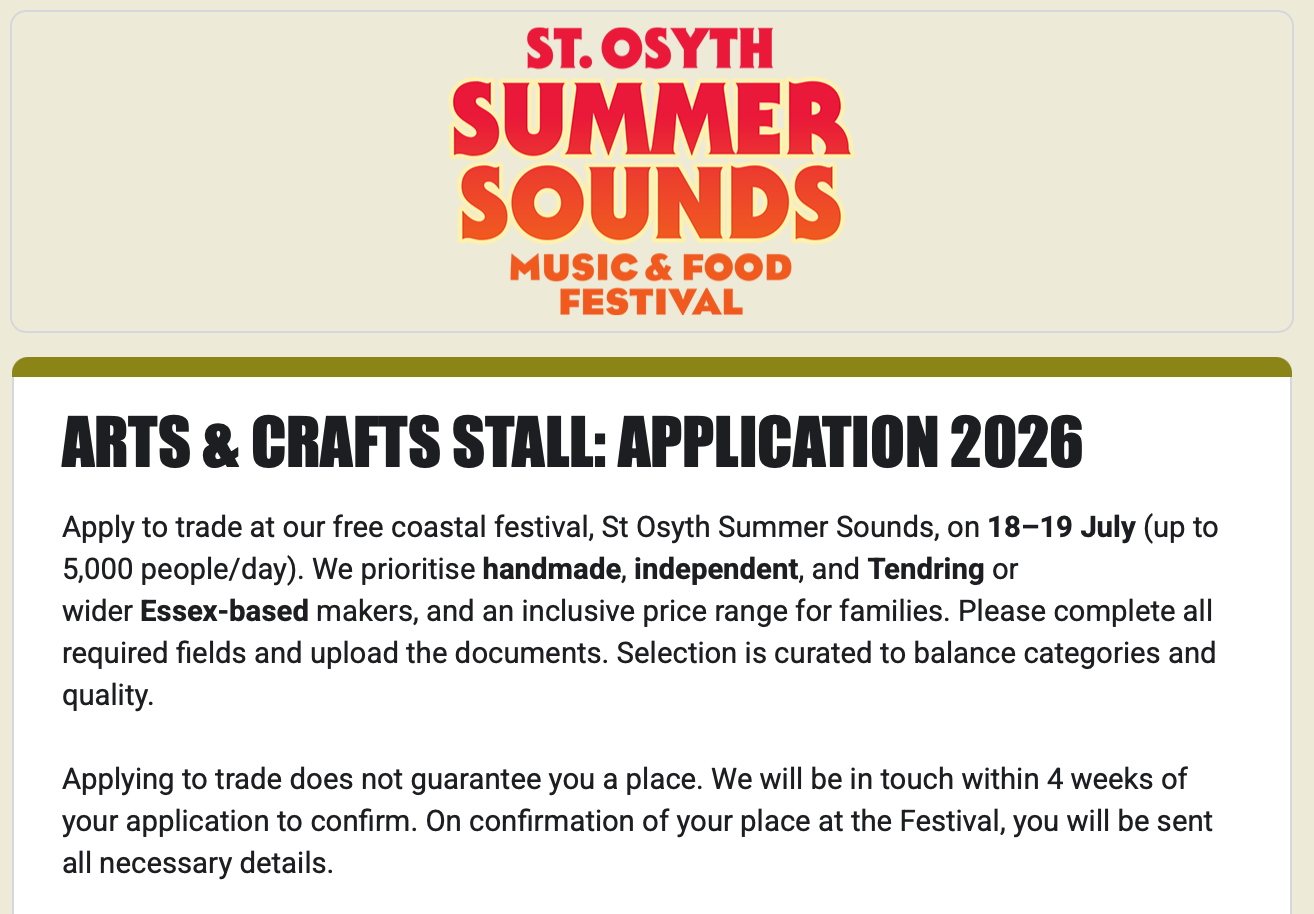 An Arts & Crafts Trader is anyone selling non-food items such as jewellery, prints, artwork, handmade crafts, homeware, pottery, clothing, accessories, children’s toys (non-edible), candles, soaps, skincare, gifts, or similar creative products. If your products are not for consumption, you should complete the Arts & Crafts Trader Form.